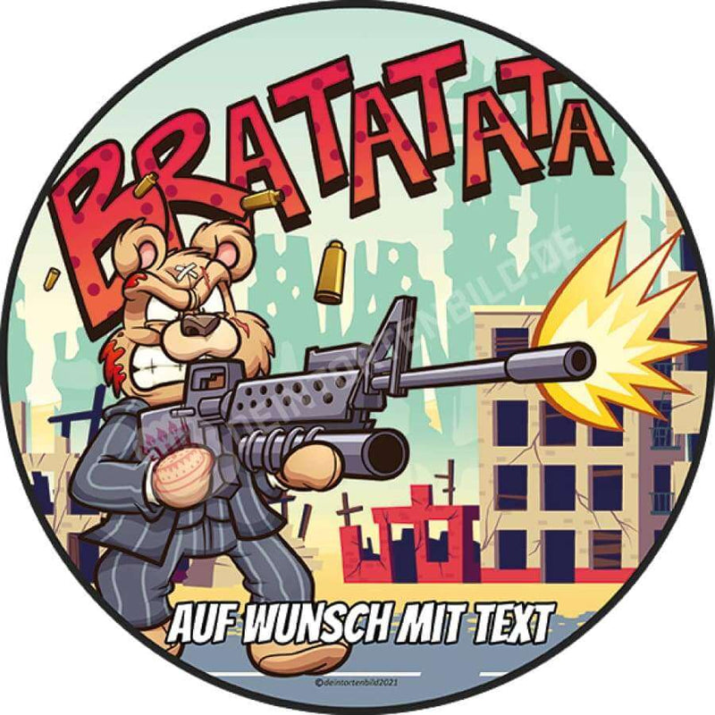 This funny cake topper with a cartoon bear shooting a submachine gun is an ideal gift for your loved ones. As a highlight, you can add a personal text of your choice. You can serve the topper on cakes, pies and cupcakes. Present your home-baked goods with this personal cake image and enjoy the surprised faces of your loved ones.