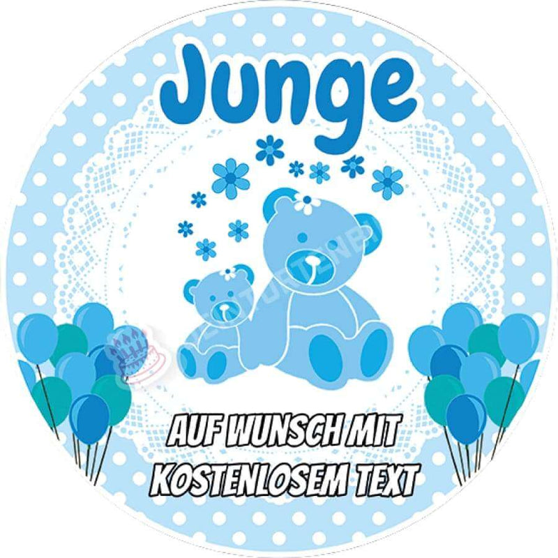 Dieser Tortenaufleger mit einem hellblauen Rahmen, zwei Teddys in der Mitte und dem Schriftzug "Junge" ist ein ideales Geschenk für eine Babyparty. Als Highlight können Sie einen persönlichen Wunschtext hinzufügen. Den Aufleger können Sie auf Torten, Kuchen und Cupcakes servieren. Präsentieren Sie Ihr selbst gebackenes mit diesem persönlichen Tortenbild und freuen Sie sich über die überraschten Gesichter Ihrer Lieben.