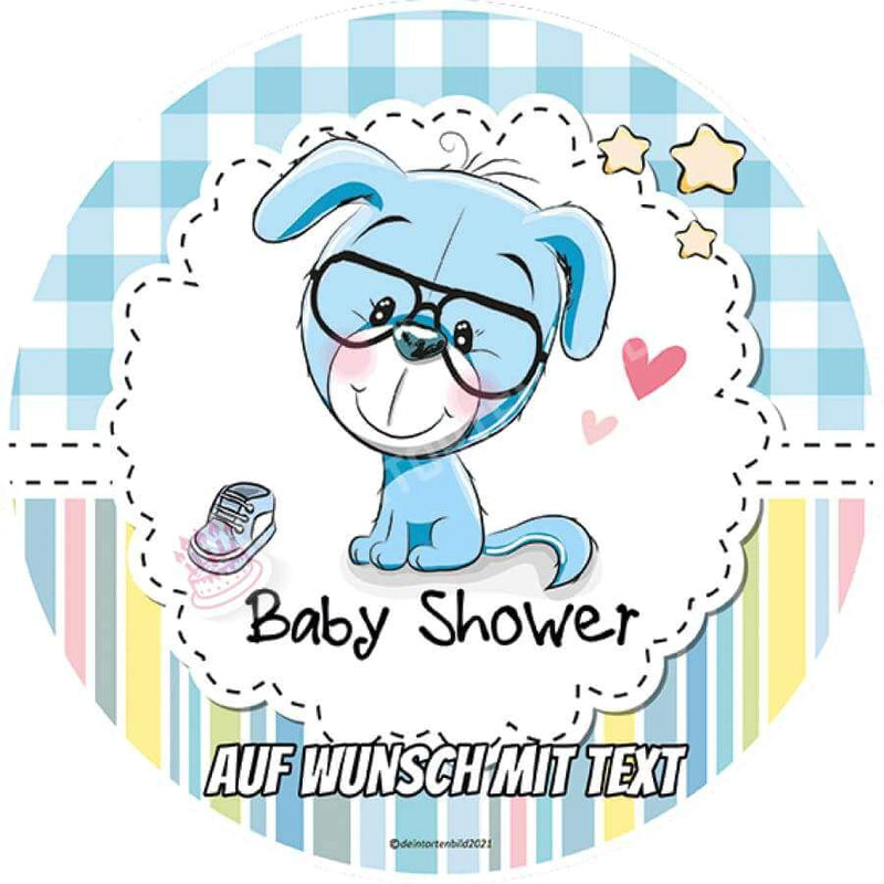 Dieser Tortenaufleger mit einem blauen Hund mit Brille und dem Schriftzug "Baby Shower" ist ein ideales Geschenk für eine Babyparty oder als Überraschung für Ihre Kleinen. Als Highlight können Sie einen persönlichen Wunschtext hinzufügen. Den Aufleger können Sie auf Torten, Kuchen und Cupcakes servieren. Präsentieren Sie Ihr selbst gebackenes mit diesem persönlichen Tortenbild und freuen Sie sich über die überraschten Gesichter Ihrer Lieben.