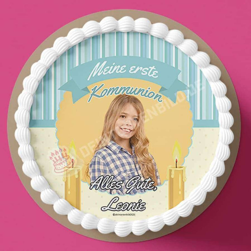 Unser Tortenaufleger mit einem hellblauen Rahmen und zwei Kerzen für die erste Kommunion ist ein ideales Geschenk für besondere Menschen. Beglücken Sie ihre Liebsten zu Ihrer ersten Kommunion. Als Highlight können Sie in den Kreis ein persönliches Bild einfügen. Das Tortenbild lässt sich wunderbar auf Torten, Kuchen und Cupcakes legen.